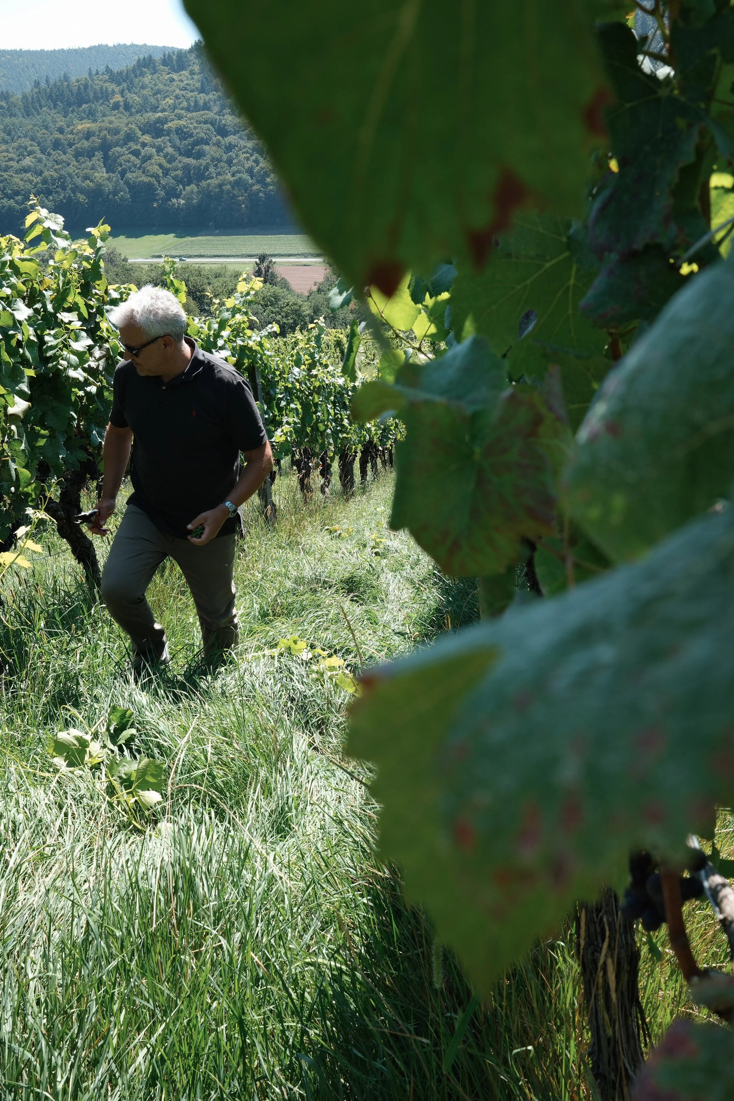 Weinberge, Winzer und Fassproben haben mich schon immer fasziniert. Als Corona uns alle heimsuchte, lernte ich einen Winzer kennen, der mir sagte: „Du redest zu viel über Wein! Wir suchen dir einen kleinen Weinberg, und ich schreibe dir das Drehbuch dazu – alles easy“. 2021 war es dann so weit, und ich fing an, eine kleine Steillage in Klingenberg zu bewirtschaften. Seitdem bin ich in meiner Freizeit jede Woche draußen egal wie das Wetter ist. Unser 2021 Pinot Noir, den wir als Landwein abgefüllt haben, ist genau dieser erste Wein.